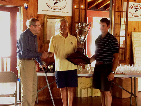 Hank Rowan presenting the trophy for the 2014 12th District Championships to Rick Dhein and son Clark Dhein.